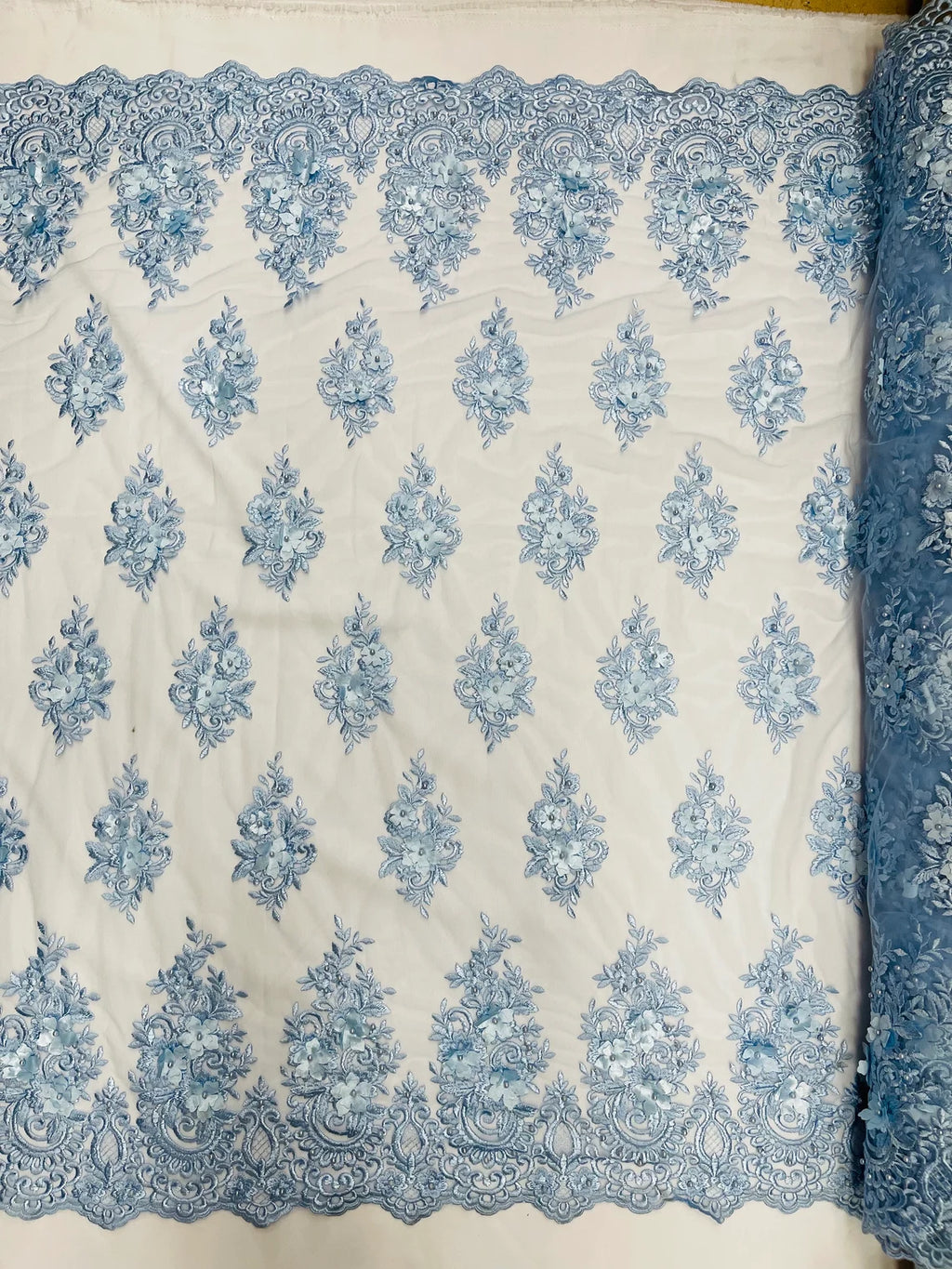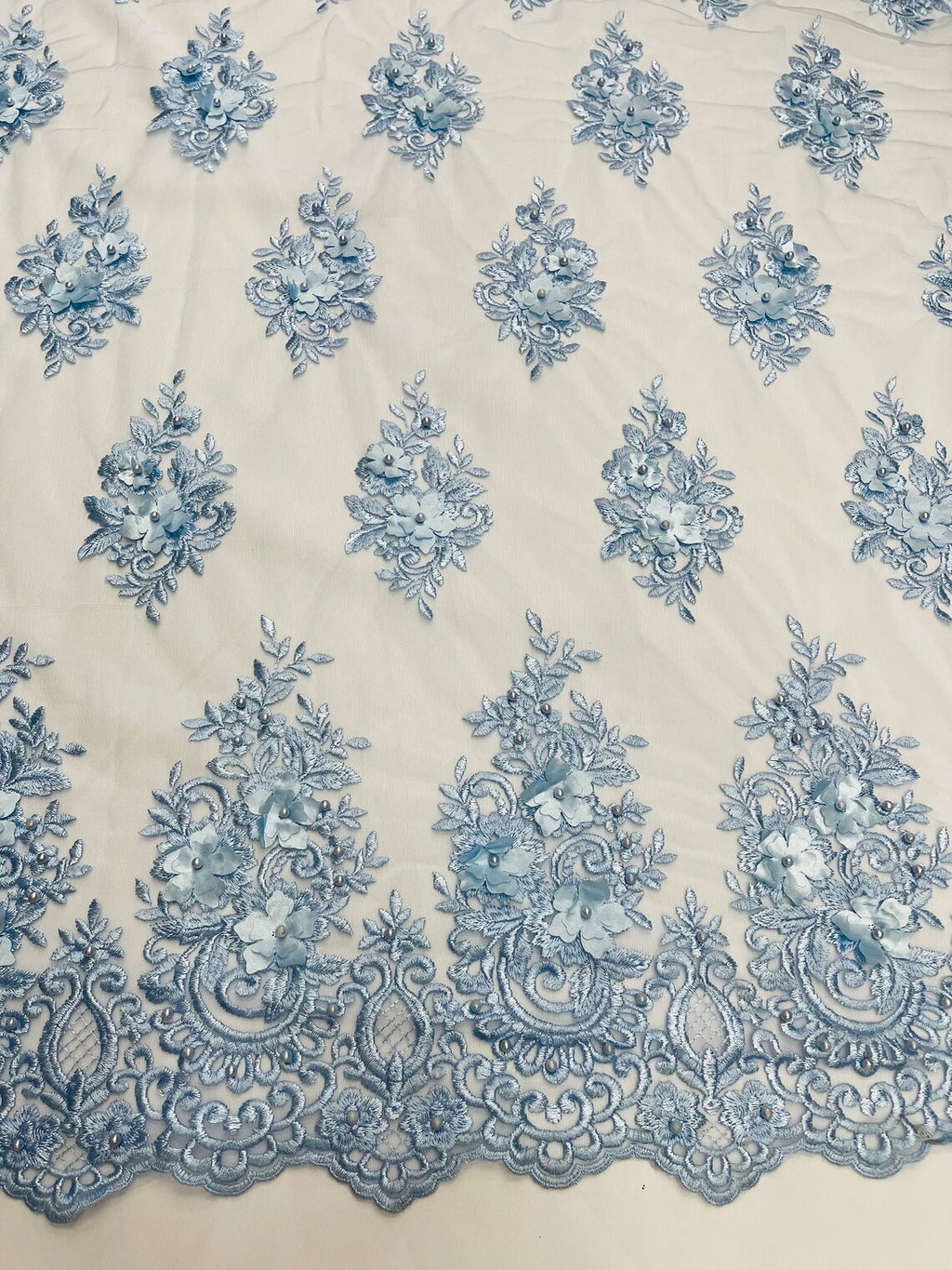 3D Fancy Floral Design Fabric - Baby Blue - 3D Flower Fabric with Small Beads on Lace Sold By Yard
