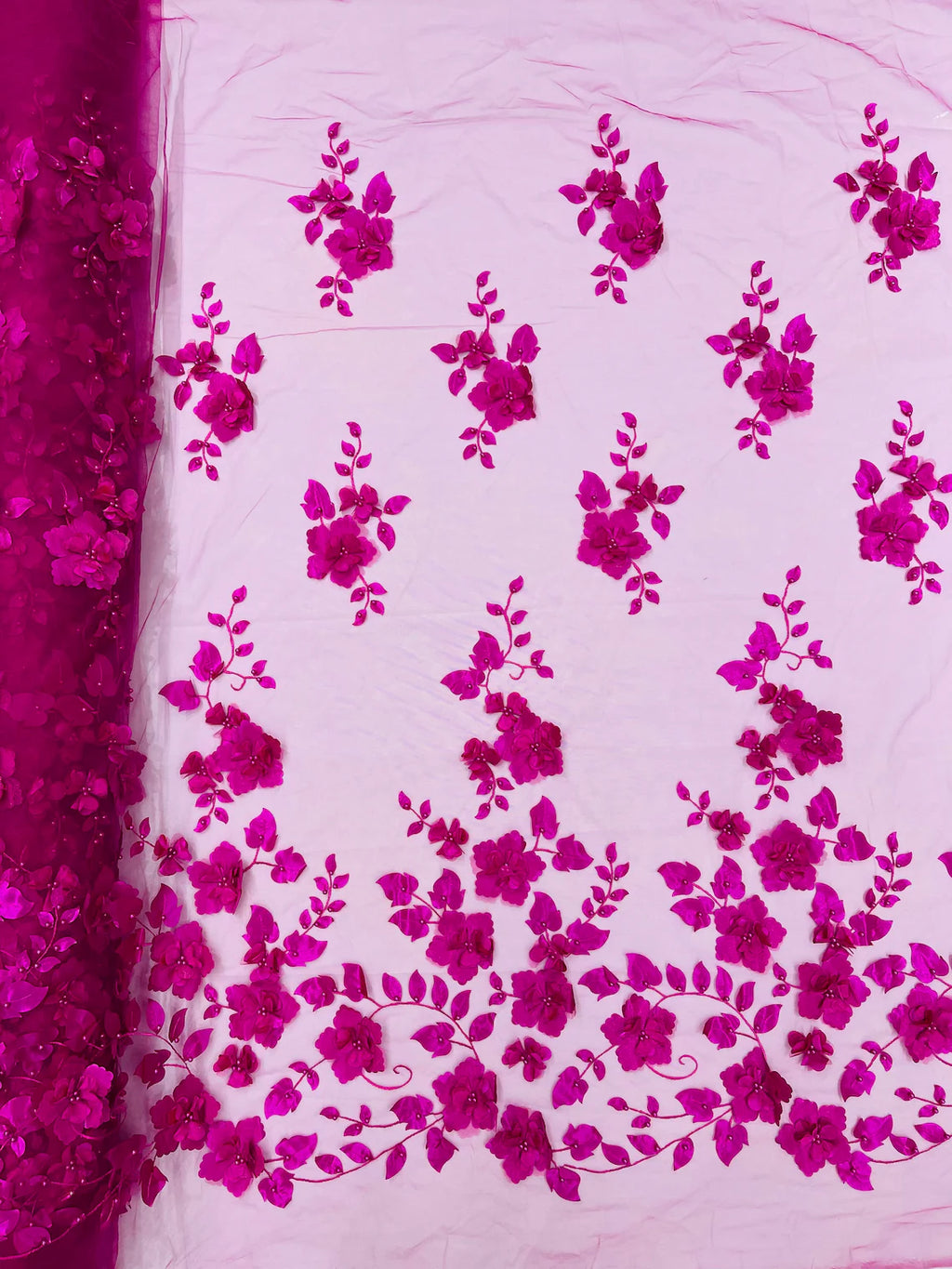 3D Floral Pearl Fabric - Magenta - Embroidered Floral Pearl Fabric Single Border On Mesh By Yard