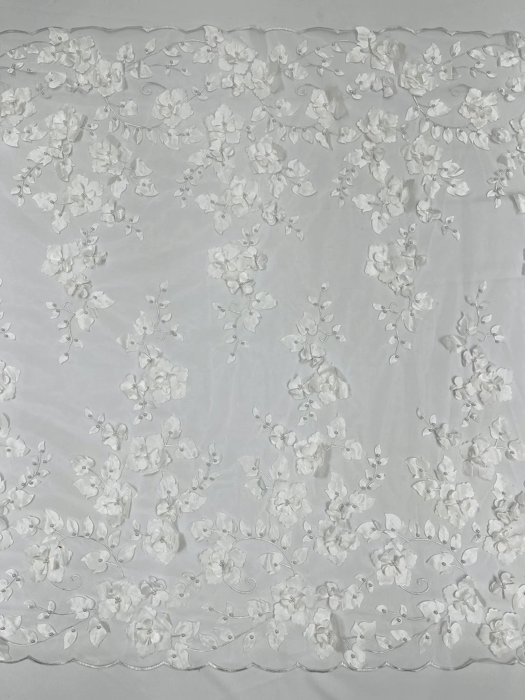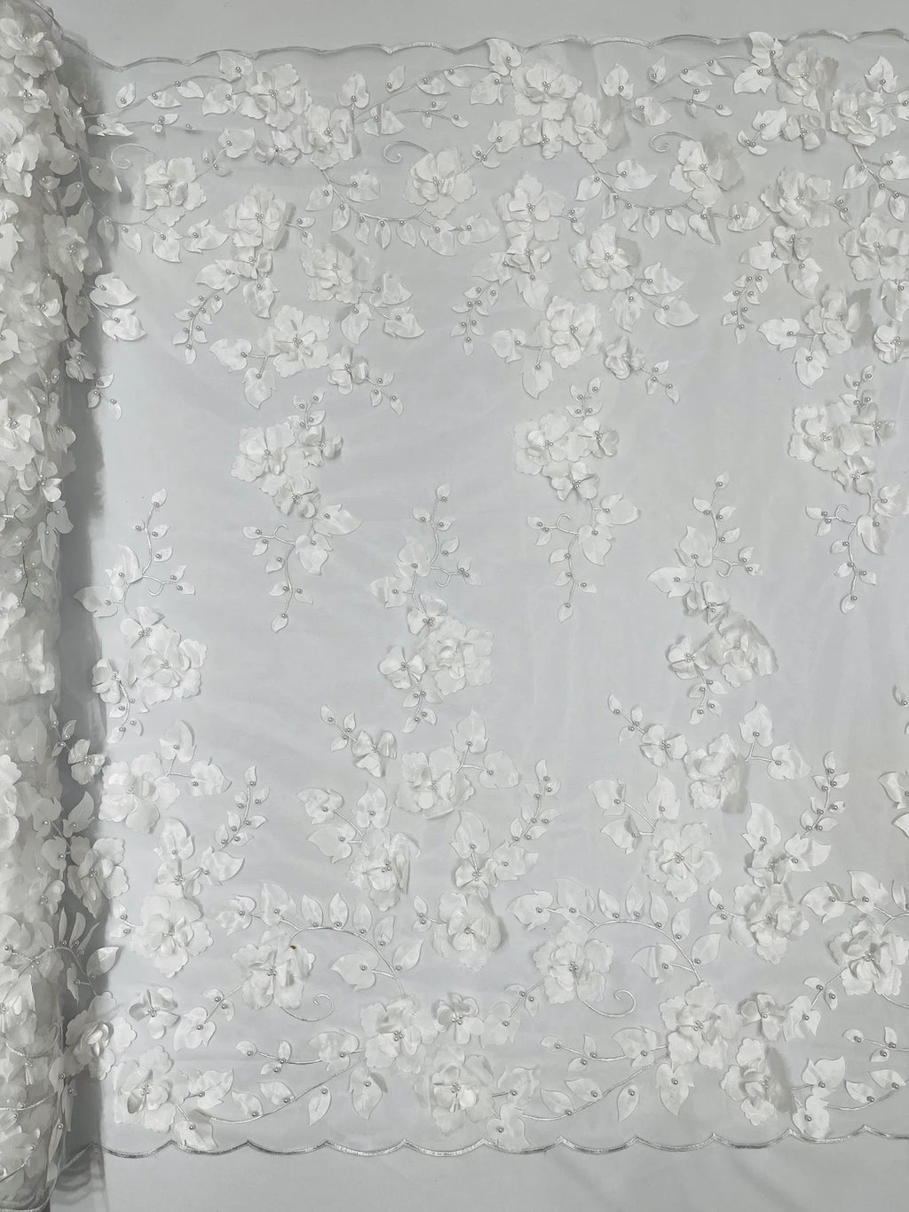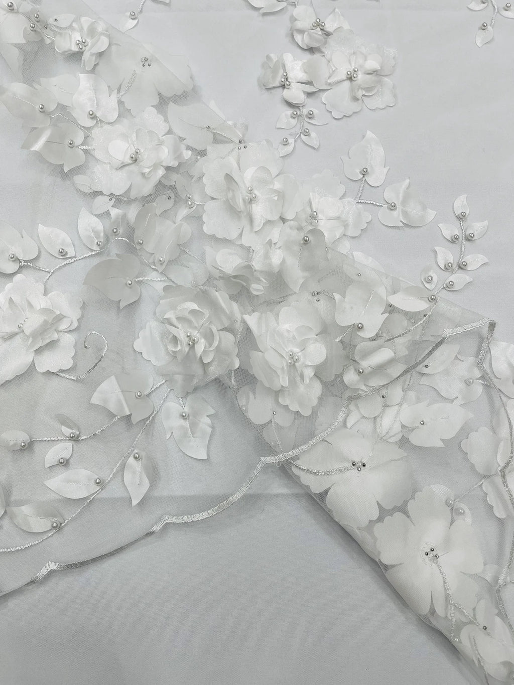 3D Floral Pearl Fabric - White - Embroidered Floral Pearl Fabric Double Border On Mesh By Yard
