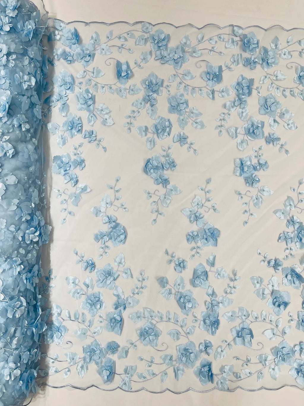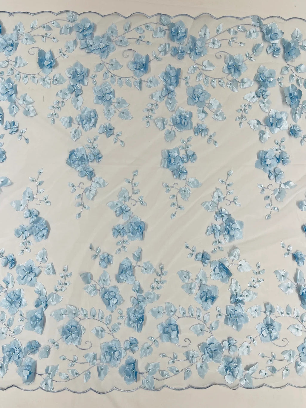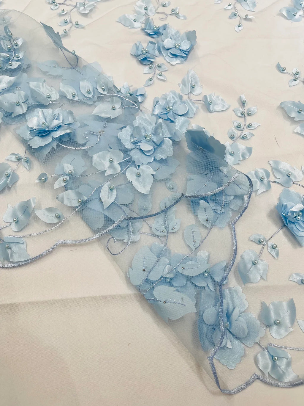 3D Floral Pearl Fabric - Baby Blue - Embroidered Floral Pearl Fabric Single Border On Mesh By Yard