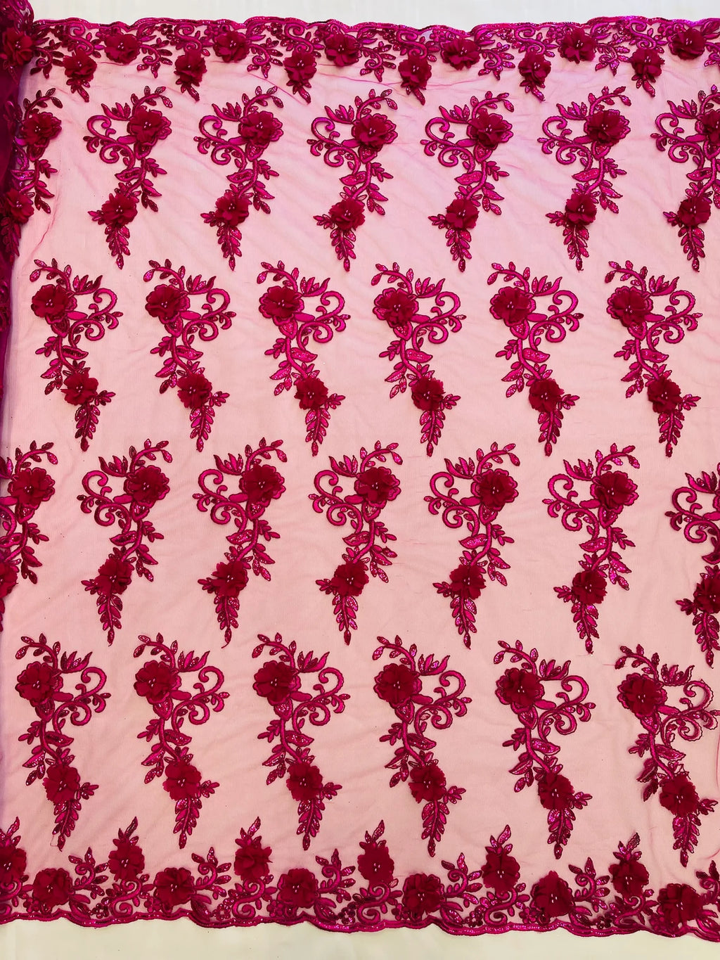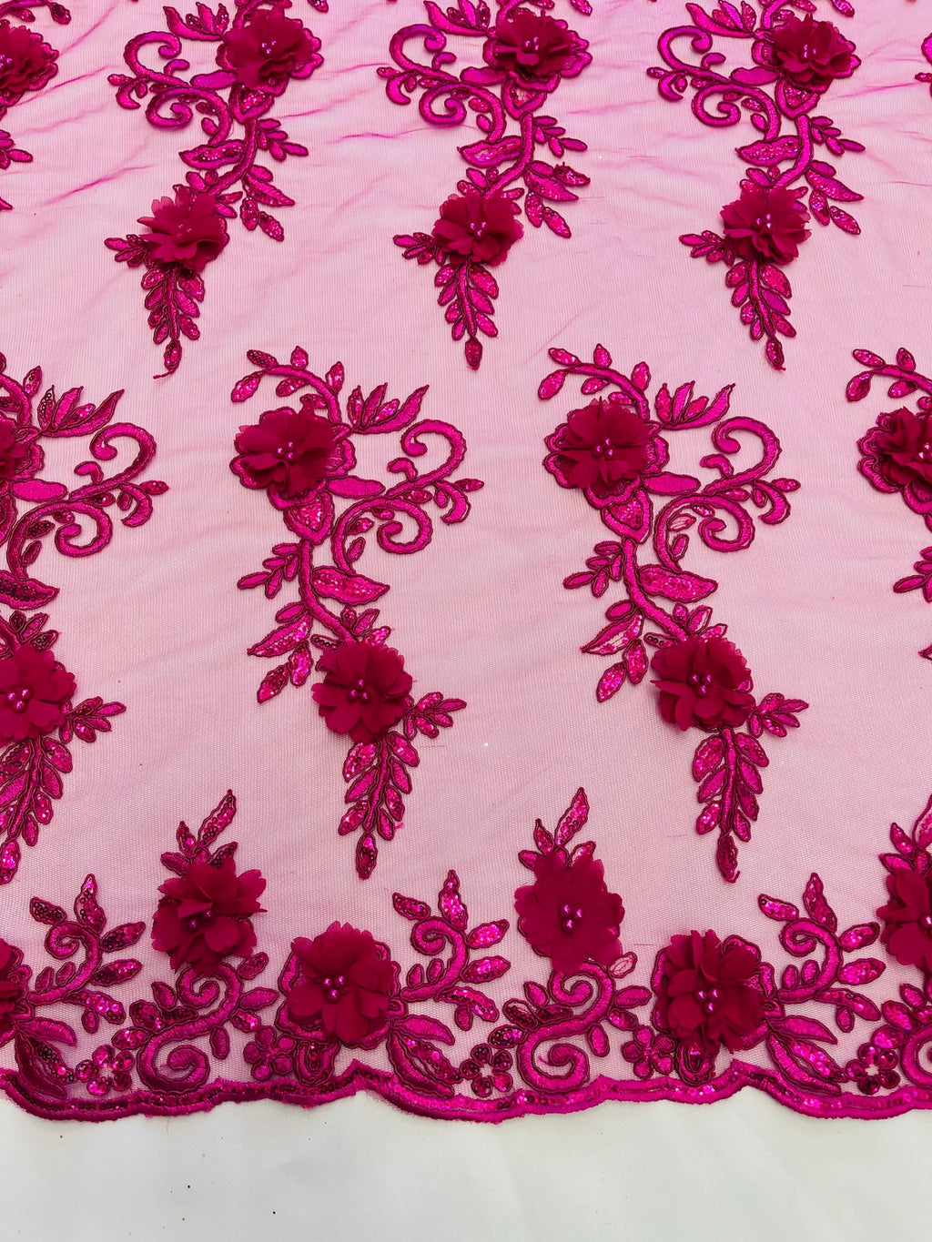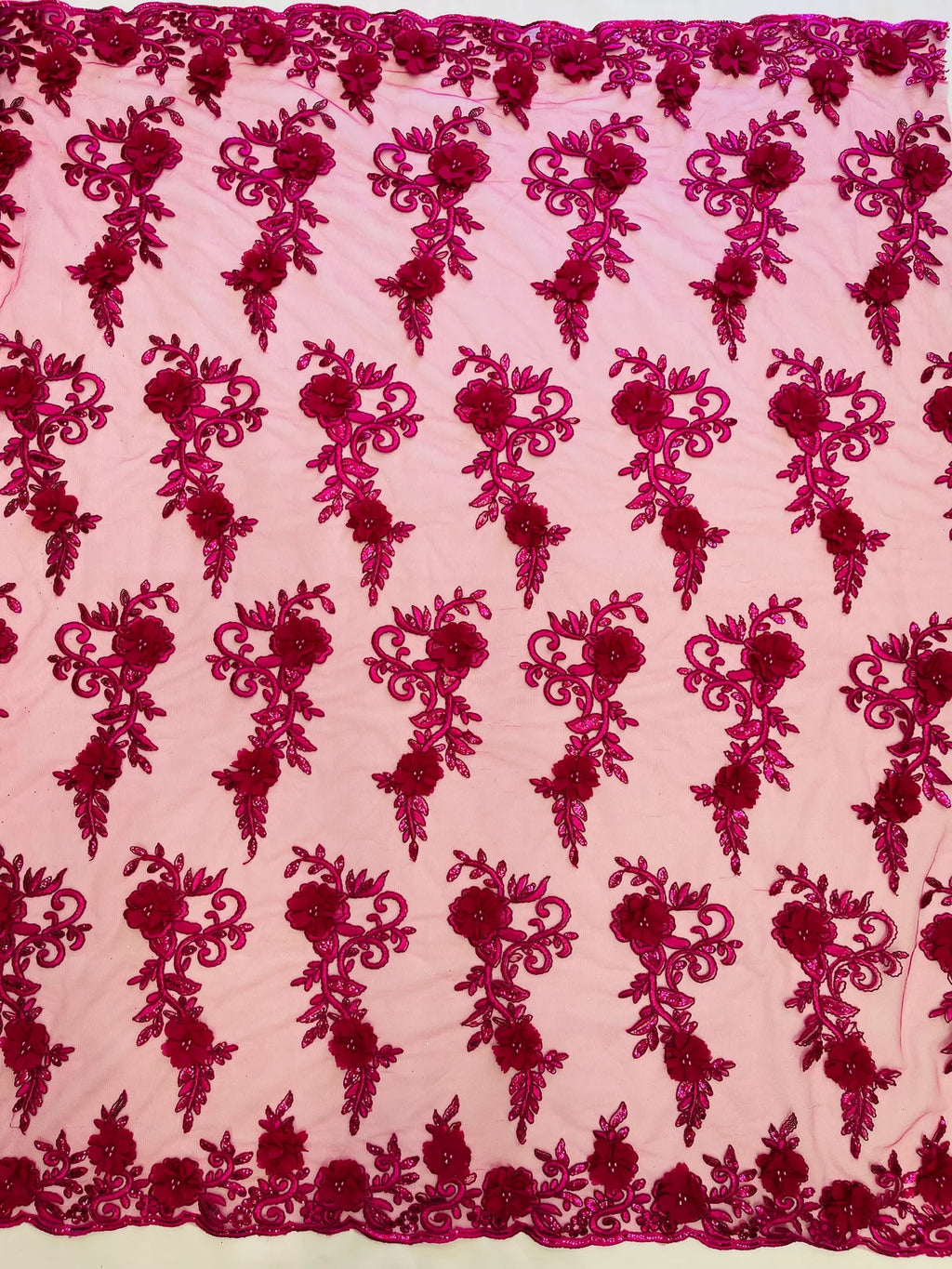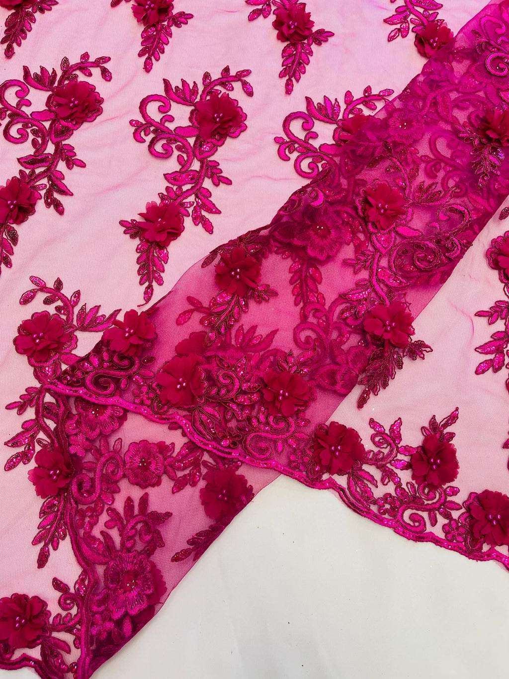 3D Flower Cluster Fabric - Fuchsia - 3D Flower Leaf Design Fabric with Pearls Sold By Yard