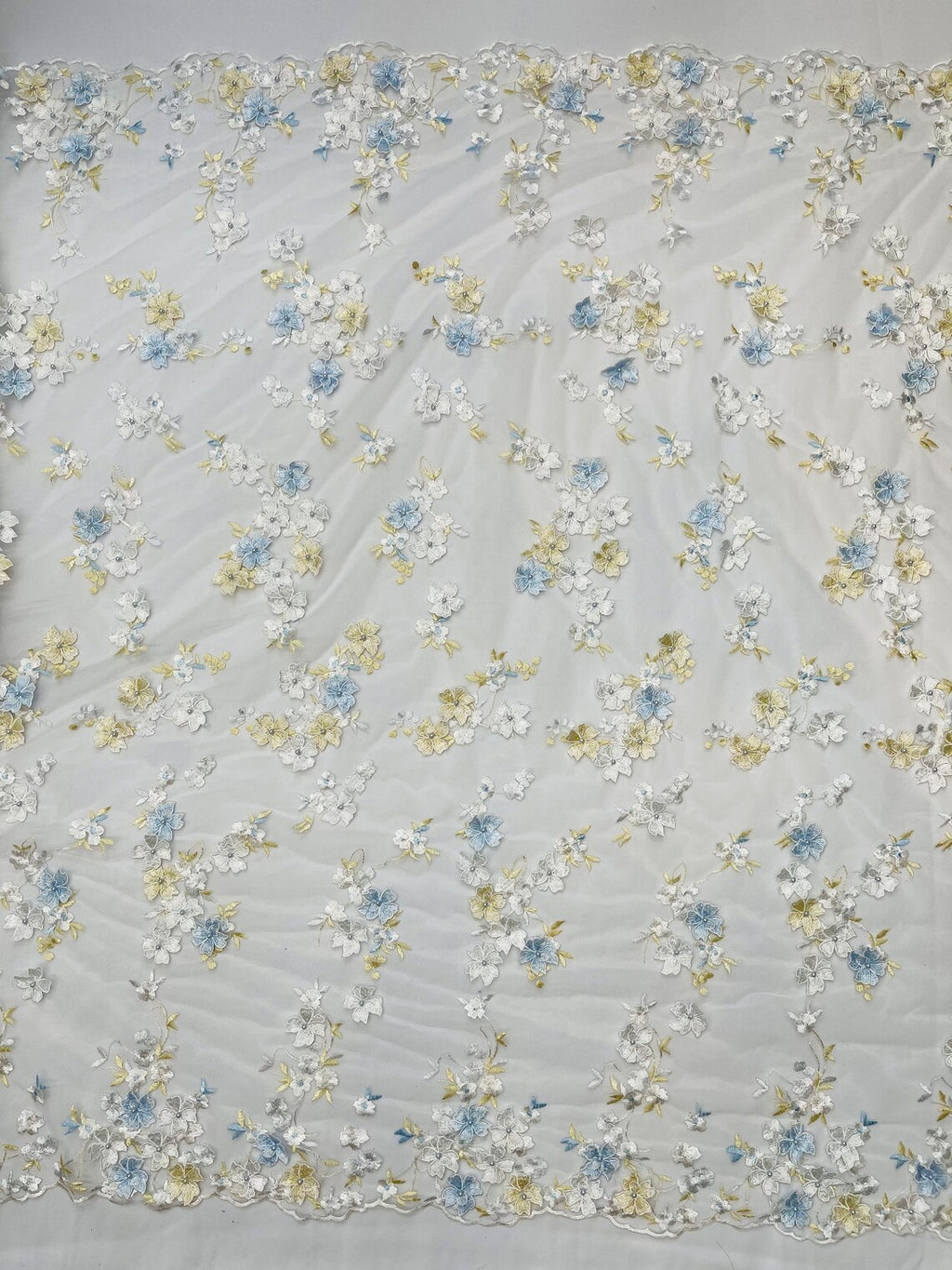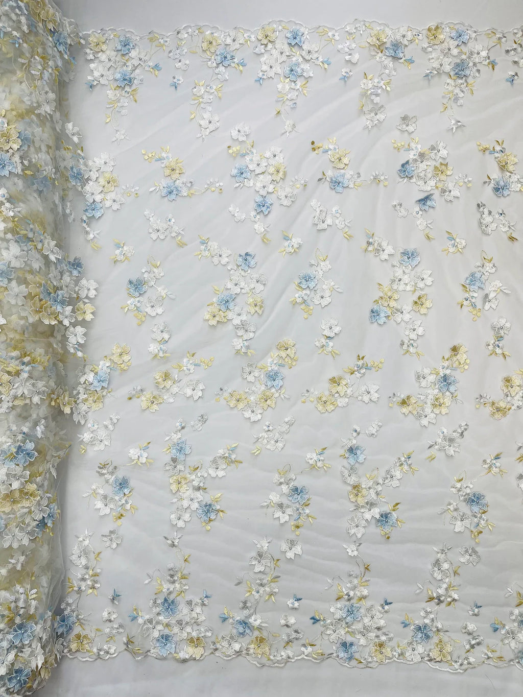 A beautiful floral embroidered lace with 3D flowers on mesh lace.